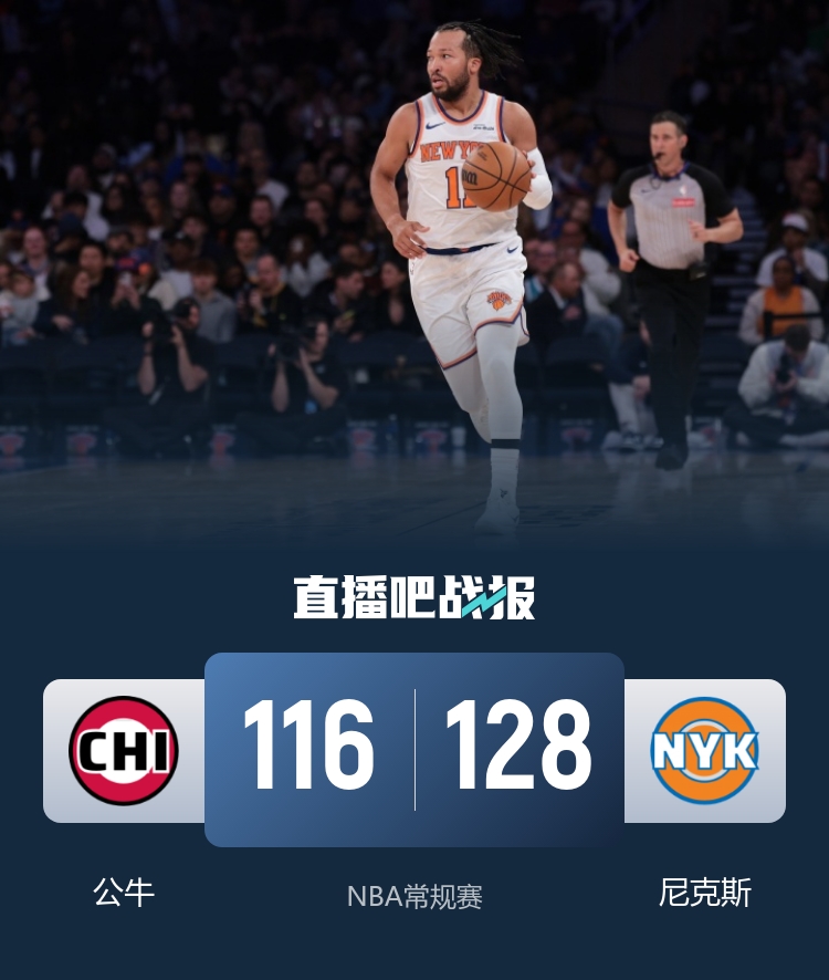 此役一上来两队开局陷入缠斗,布伦森予取予求单节狂揽19分,唐斯外线续上火力,两人联手率队拉开比分,首节结束时尼克斯确立10分优势,次节回来,尼克斯进攻短暂停滞,公牛一波10-0实现反超,阿努诺比联手克拉克森稳住局势,半场战罢,尼克斯依然领先8分。短暂休整后公牛延续追分势头,但尼克斯多点开花总能回应,三节结束后尼克斯已经领先16分,末节上来,尼克斯稳扎稳打扩大战果,公牛没有放弃无奈分差过大,最终尼克斯128-116击败公牛终结三连败,同时终结对手开局5连胜。